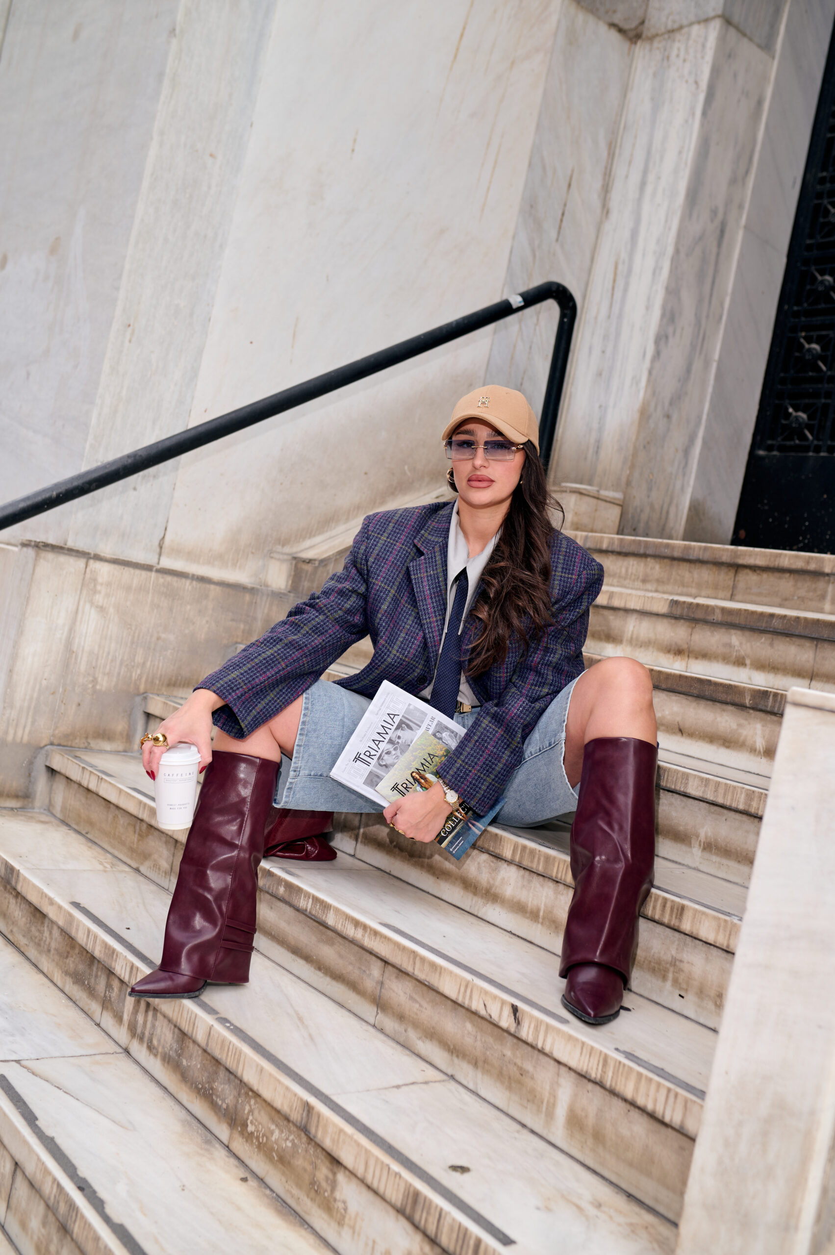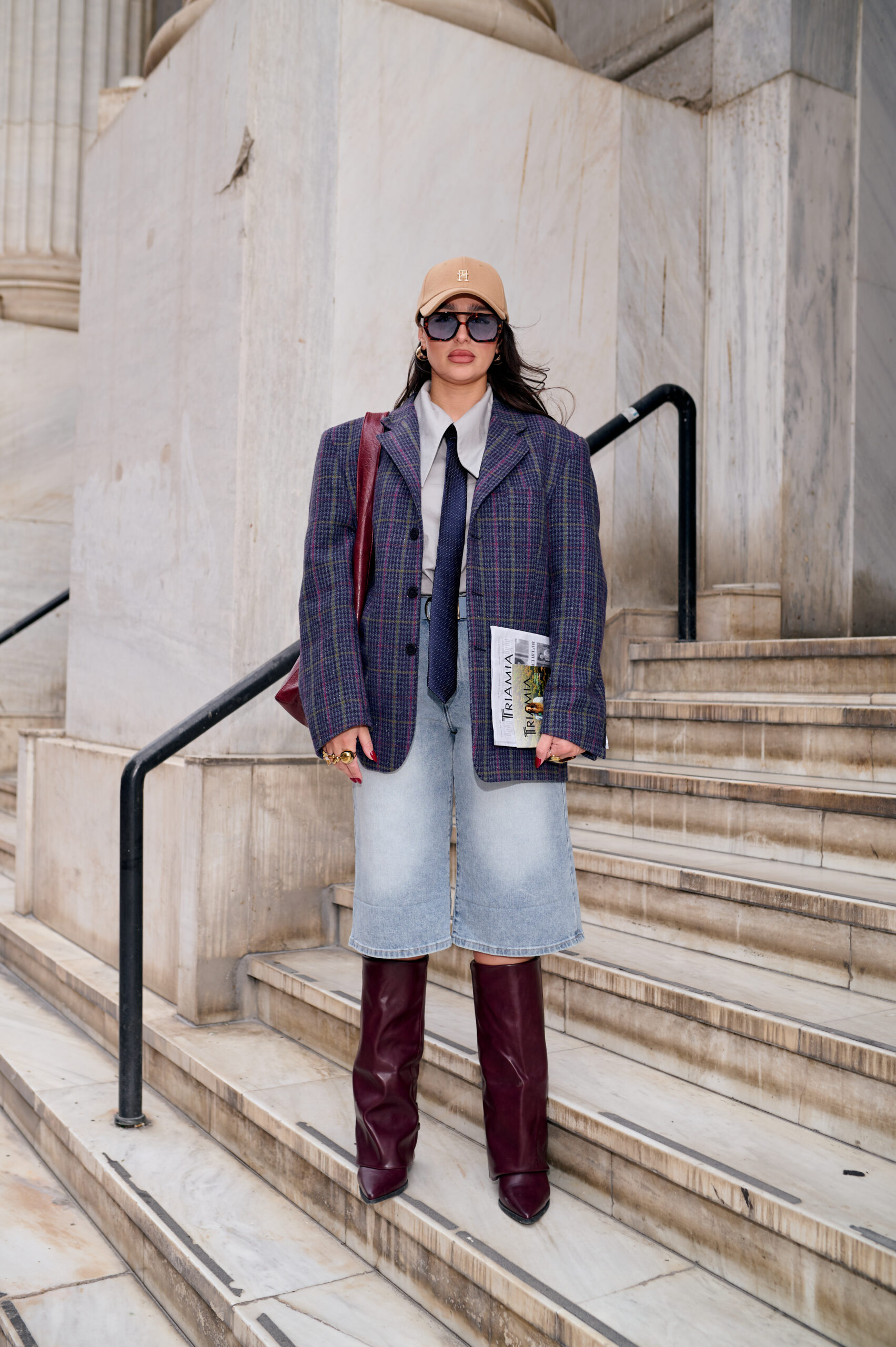 Συνδυασμένο με λευκό πουκάμισο και υφασμάτινο παντελόνι ή pencil φούστα,
