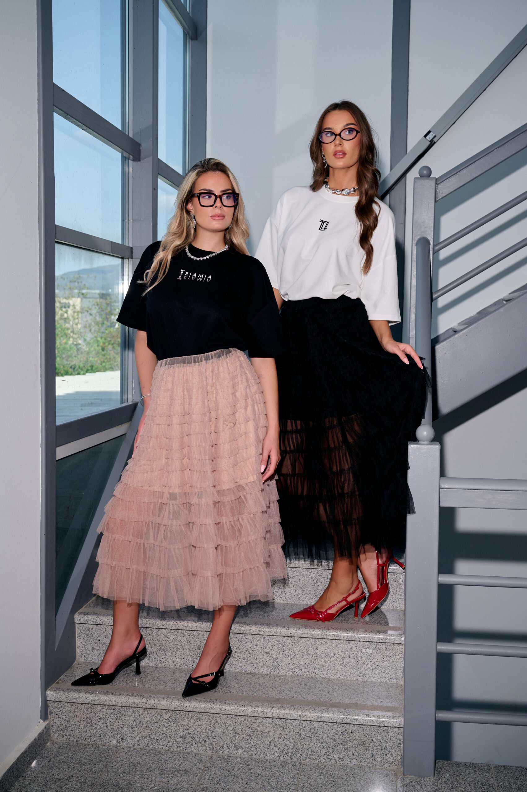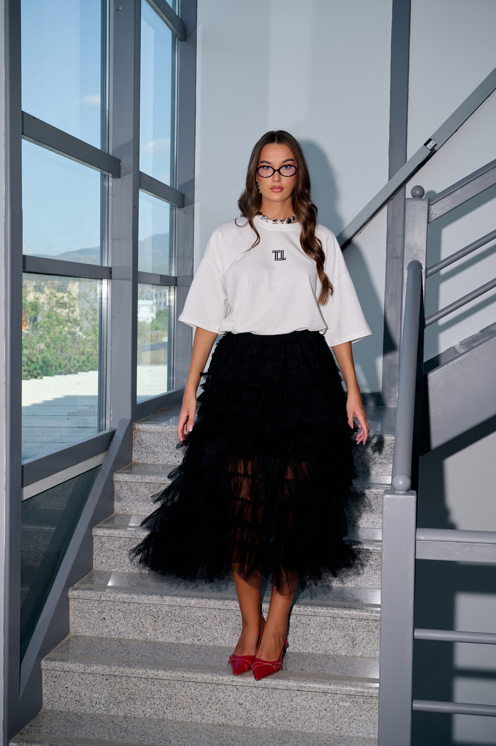 Η φούστα από απαλό τούλι σε κομψή μαύρη απόχρωση, με μήκος μέχρι τον αστράγαλο,